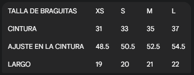 | Talle | Largo (cm) | Cintura (cm) | Cadera (cm) |